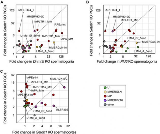 圖7:Setdb1、Dnmt3l和Pld6基因敲除突變效應(yīng)的比較(亞家族水平分析)。