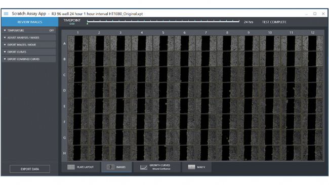 強(qiáng)大的 Gen 5 軟件,可以自動(dòng)識(shí)別劃痕邊緣,批量計(jì)算每個(gè)時(shí)間的劃痕匯合度百分比,并生成動(dòng)態(tài)視頻和統(tǒng)計(jì)圖表(最大愈合速率等),數(shù)據(jù)導(dǎo)出一步到位。