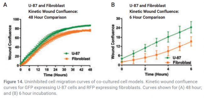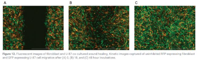 將表達(dá) GFP 的 U-8 細(xì)胞與表達(dá) RFP 的原代成纖維細(xì)胞均稀釋至 3.0×105 cells/mL,按 1:1 比例混合后接種于 96 孔板中。待細(xì)胞貼壁形成單層細(xì)胞后用 AutoScratch 創(chuàng)建劃痕。然后將孔板置于 Cytation 5 系統(tǒng)中(37°C/5%CO