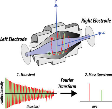 傅里葉變換離子回旋共振質(zhì)量分析器利用離子在均勻磁場中的回旋運動來進(jìn)行質(zhì)量分析。離子被注入到充滿強(qiáng)磁場的分析室中,在磁場作用下,離子做圓周運動,其回旋頻率與質(zhì)荷比成反比。通過檢測離子的回旋頻率,經(jīng)過傅里葉變換處理,得到離子的質(zhì)荷比 (圖5)。它具有超高的分辨率和質(zhì)量精度,能夠精確測定離子的質(zhì)量,對于復(fù)雜混合物中化合物的鑒定和結(jié)構(gòu)解析具有獨特優(yōu)勢。但設(shè)備成本高、維護(hù)復(fù)雜,分析速度相對較慢。主要應(yīng)用于高端科研領(lǐng)域,如天然產(chǎn)物的結(jié)構(gòu)鑒定、代謝組學(xué)研究中對生物樣品中微量成分的精確分析等。