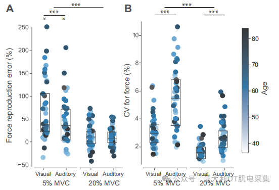 在5% MVC條件下,力量復(fù)制誤差隨年齡增長顯著增加(β=18.8, P=0.005),且視覺反饋下的誤差顯著高于聽覺反饋(P<0.001)。在20% MVC條件下,年齡與反饋方式均無顯著影響。誤差在低力量下更高(β=-35.6, P<0.001),且視覺反饋在低力量下的劣勢更為明顯(交互作用P=0.024)。