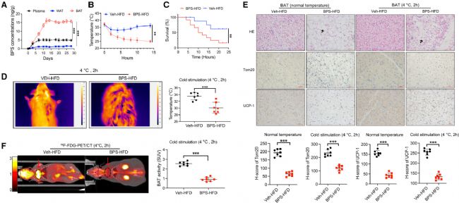 FCCP(Carbonyl cyanide-4-(trifluoromethoxy)phenylhydrazone,AbMole,M9051),實驗人員揭示了雙酚S(BPS)在肥胖發(fā)生發(fā)展中的作用機制:BPS暴露會以加劇雌性小鼠的飲食誘導肥胖,其背后機制是BPS通過誘導棕色脂肪組織(BAT)"變白"(whitening)導致產(chǎn)熱功能障礙,并導致脂肪累積。FCCP(fluoro carbonyl cyanide phenylhydrazone,羰基氰化物-4-(三氟甲氧基)苯腙)是一種經(jīng)典的線粒體解偶聯(lián)劑,在該研究中發(fā)揮了關鍵的作用:通過FCCP刺激后的OCR變化,可以精準量化BPS暴露對棕色脂肪細胞線粒體功能的損傷程度,直接驗證BPS是否通過抑制線粒體功能導致BAT變白。