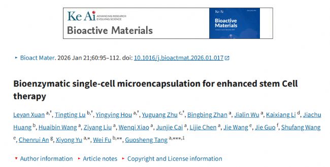 基于此,廣州醫(yī)科大學(xué)唐國勝教授團隊、余細勇教授團隊聯(lián)合上海兒童醫(yī)學(xué)中心付煒教授團隊在Bioactive Materials(IF:20.3) 雜志發(fā)表題為“Bioenzymatic single-cell microencapsulation for enhanced stem Cell therapy”的研究論文。
