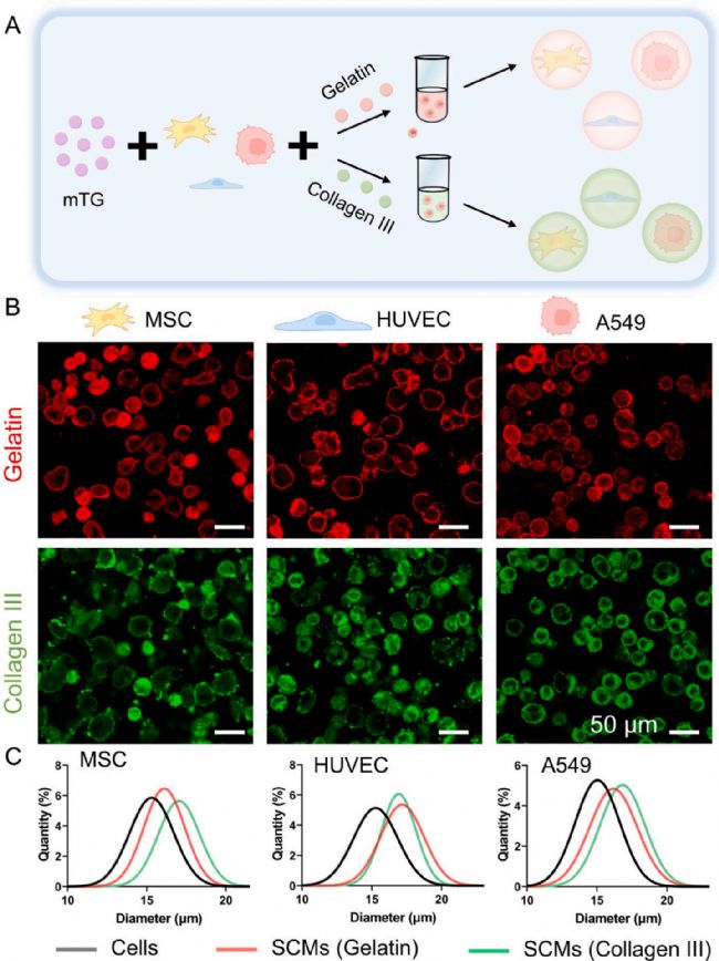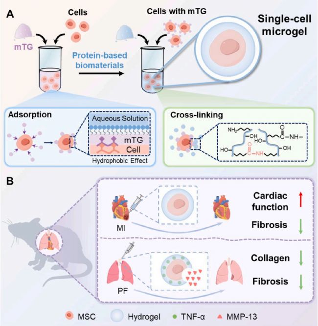 本研究建立了基于微生物轉(zhuǎn)谷氨酰胺酶吸附(“生物酶介導(dǎo)交聯(lián)”)的簡單生物酶策略,成功制備出高單細胞封裝效率、能維持細胞活力且兼容多種細胞類型與水凝膠材料的單細胞微凝膠(SCMs)。通過心肌梗死(MI)和肺纖維化(PF)兩種疾病模型驗證,該策略展現(xiàn)出顯著的組織修復(fù)與再生效果,其水凝膠層可大幅提升病理環(huán)境中細胞的滯留率和存活率,有效恢復(fù)心臟功能并改善肺纖維化,凸顯了在細胞療法中的臨床應(yīng)用潛力。