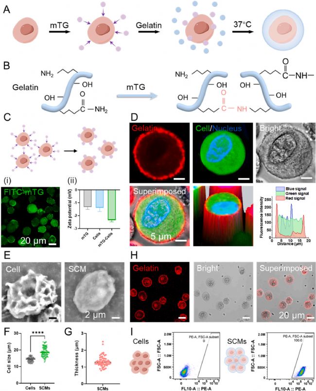 以明膠為模型材料,通過mTG介導(dǎo)的轉(zhuǎn)酰胺交聯(lián)反應(yīng)制備SCMs,經(jīng)FITC標記mTG驗證酶分子成功吸附,zeta電位檢測證實細胞表面仍維持凈負電荷。SCMs表面較未包裹細胞更光滑,尺寸顯著增大,水凝膠層厚度達1.34±0.32μm,凝膠化過程中細胞保持單細胞狀態(tài)無聚集。激光共聚焦顯微鏡(CLSM)和流式細胞術(shù)定量顯示,該策略實現(xiàn)100%的單細胞封裝效率,且大幅提升微凝膠生產(chǎn)通量,突破傳統(tǒng)方法的效率與規(guī);款i。