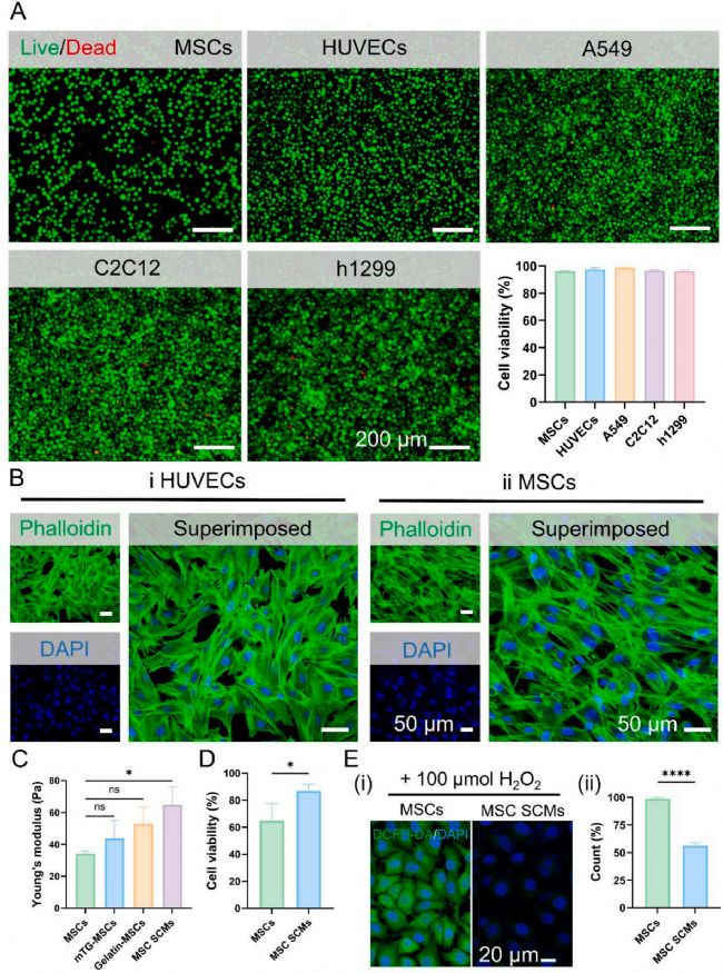 SCMs展現(xiàn)出優(yōu)異的生物相容性,MSCs、HUVECs、A549等多種細胞封裝24h后存活率均>95%,且溫和的封裝過程保留了細胞骨架完整性及細胞間連接。力學(xué)表征顯示,SCMs的楊氏模量顯著高于未包裹細胞,在流體剪切力作用下,其存活率遠高于未包裹組;同時,SCMs可通過物理屏障與明膠自身弱抗氧化性,顯著降低過氧化氫(H2O2)誘導(dǎo)的活性氧(ROS)水平。此外,水凝膠層在體內(nèi)36h 內(nèi)可完全降解,48h內(nèi)細胞能突破凝膠層擴散,兼顧保護作用與功能發(fā)揮。