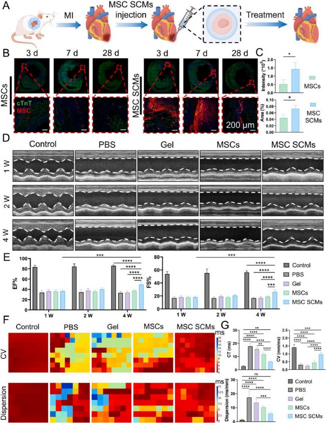 在大鼠MI模型中,通過CM-DiD熒光追蹤發(fā)現(xiàn),SCMs組在移植后第3、7、28天的細胞滯留率顯著高于未包裹組,且細胞主要定位于心肌組織,心外擴散少。超聲心動圖監(jiān)測顯示,治療4周后SCMs組左心室射血分數(shù)(LVEF)顯著升高,左心室短軸縮短率(LVFS)同步改善;多通道電生理標測結(jié)果表明,SCMs組能顯著縮短傳導(dǎo)時間、提升傳導(dǎo)速度,減少離散度,數(shù)值接近正常對照組,凸顯其在MI治療中的功能修復(fù)優(yōu)勢。