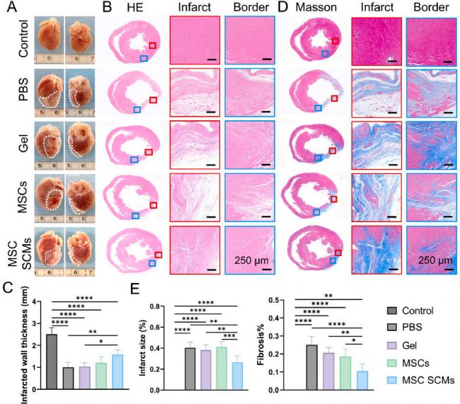 MI模型4周后,觀察心臟梗死區(qū)面積,結(jié)果顯示SCMs組梗死面積顯著小于其他組;HE染色證實其心肌組織再生更廣泛,心室壁厚度顯著增加;馬松三色染色顯示,SCMs組左心室瘢痕面積減小、成纖維細胞浸潤減少,有效減輕纖維化并防止心肌變薄。定量分析進一步驗證了這些形態(tài)學(xué)改善,且治療后28天對肝、脾、肺、腎等主要器官的組織學(xué)評估未發(fā)現(xiàn)病理變化,證實了SCMs移植的生物相容性與安全性。