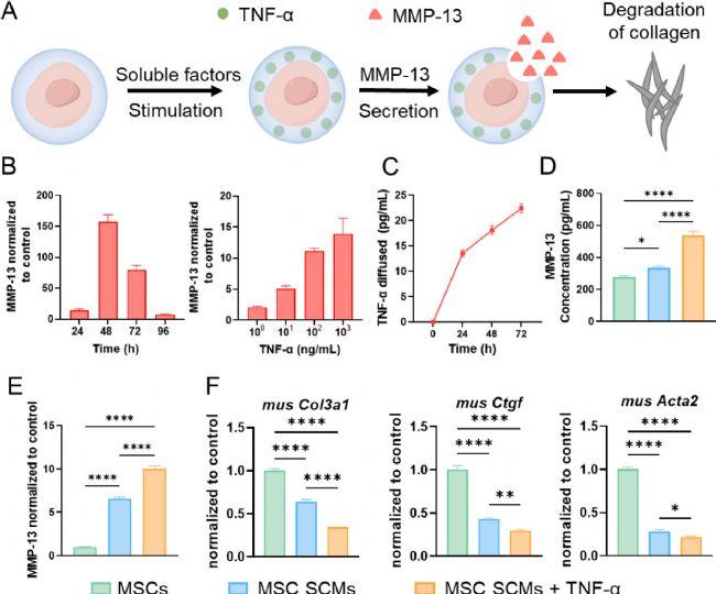 6. TNF-α與SCMs協(xié)同增強MSCs旁分泌功能TNF-α可濃度依賴性誘導(dǎo)MSCs分泌MMP-13,在100ng/mL濃度、孵育2天時達到分泌峰值,且誘導(dǎo)效果顯著優(yōu)于高濃度組。負載TNF-α的SCMs呈現(xiàn)持續(xù)緩慢釋放特性,未引發(fā)局部炎癥反應(yīng),且相較于未包裹細胞和單純SCMs,能顯著提升MMP-13的基因表達和蛋白分泌水平。在轉(zhuǎn)化生長因子-β(TGF-β)誘導(dǎo)的成纖維細胞纖維化模型中,SCMs及 TNF-α負載的SCMs可顯著下調(diào)Col3a1、Ctgf、Acta2等促纖維化基因表達,展現(xiàn)出良好的體外抗纖維化潛力。
