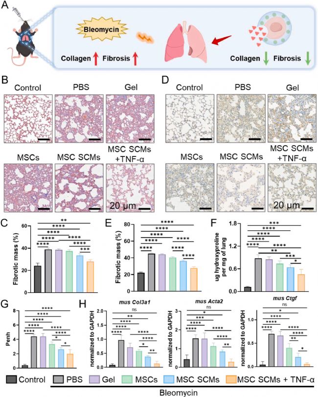 在博來霉素誘導(dǎo)的小鼠PF模型中,SCMs尤其是TNF-α負載組,可顯著減少纖維化病變面積,恢復(fù)肺泡結(jié)構(gòu)至接近健康對照組水平(約 20%)。生化檢測顯示,TNF-α負載的SCMs 組肺組織羥脯氨酸含量降至接近健康水平;呼吸功能評估顯示,該組增強式pause(Penh)指標顯著改善,肺功能恢復(fù)更佳。qRT-PCR證實,肺組織中Col3a1、Acta2、Ctgf等促纖維化基因表達下調(diào),且主要器官無病理損傷,證實SCMs通過增強MSCs旁分泌活性、促進膠原蛋白降解,實現(xiàn)高效抗纖維化治療。