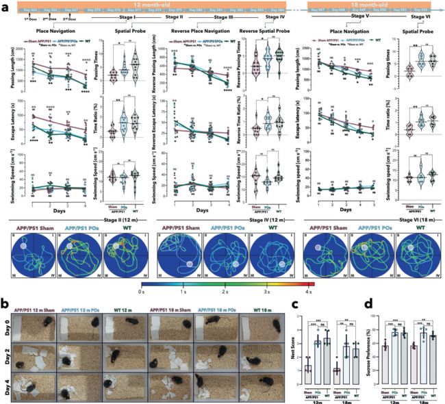 Morris 水迷宮實驗證實,治療后 AD 小鼠的空間學(xué)習(xí)和記憶能力顯著提升,與野生型小鼠無差異,且該效果持續(xù) 6 個月。同時,小鼠筑巢行為和蔗糖偏好性改善,生活質(zhì)量顯著提高。