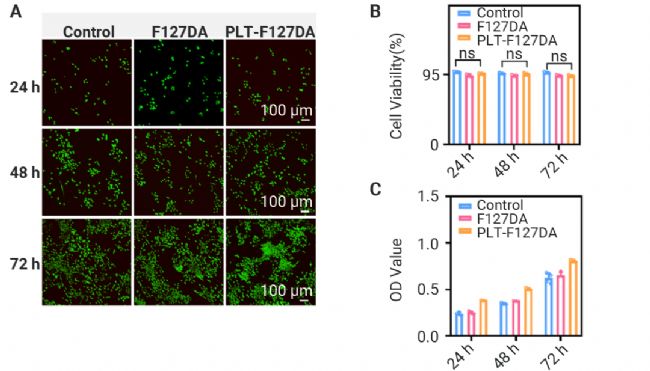 圖 2. F127DA 和 PLT-F127DA 導(dǎo)管浸出液對(duì)施萬(wàn)細(xì)胞 (SCs) 活力的影響[2]。
