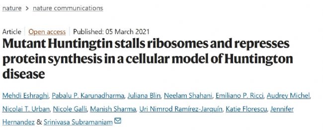 文章題目:Mutant Huntingtin stalls ribosomes and represses protein synthesis in a cellular model of Huntington disease