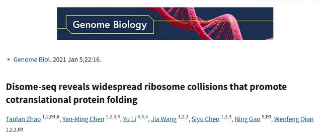 2.Zhao T, Chen YM, Li Y, Wang J, Chen S, Gao N, Qian W. Disome-seq reveals widespread ribosome collisions that promote cotranslational protein folding. Genome Biol. 2021 Jan 5;22(1):16.