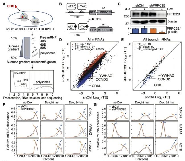 PRRC2B 結(jié)合的 mRNA 在 PRRC2B 敲除后表現(xiàn)出翻譯效率降低