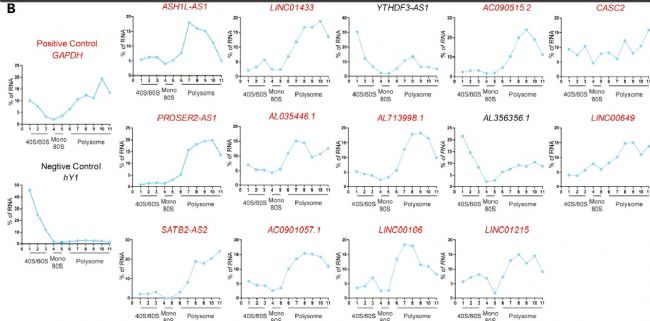 該研究是通過懸浮細(xì)胞系中的多核糖體分析來篩選潛在的微肽編碼lncRNA。當(dāng)與定量PCR相結(jié)合,有助于同時(shí)識別許多翻譯lncRNA。作者在完成polysome分離后,對各組分進(jìn)行了RNA提取和cDNA反轉(zhuǎn)錄。在通過 RT-qPCR篩選可能翻譯的lncRNA時(shí),設(shè)置了陽性和陰性對照,以評價(jià)結(jié)果的穩(wěn)健性。GAPDH等管家基因的mRNA可作為陽性對照;已知的細(xì)胞質(zhì)非編碼RNA,如hY1,可以作為陰性對照。GAPDH的峰值應(yīng)位于高多核組分中,而hY1應(yīng)富集在亞單體組分中。在 polysome組分中具有突出峰值的候選lncRNA可能表明在細(xì)胞中激活翻譯。