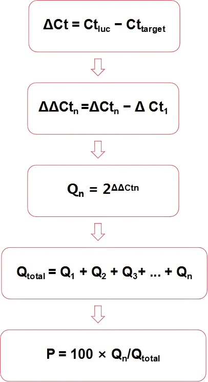 在所有組分中檢測到的目的轉(zhuǎn)錄本的總數(shù)設(shè)置為100%,每個(gè)組分中目的轉(zhuǎn)錄本的比例用百分比表示。
