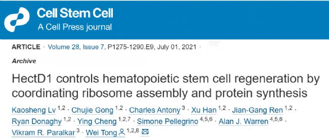 文章題目:HectD1 controls hematopoietic stem cell regeneration by coordinating ribosome assembly and protein synthesis