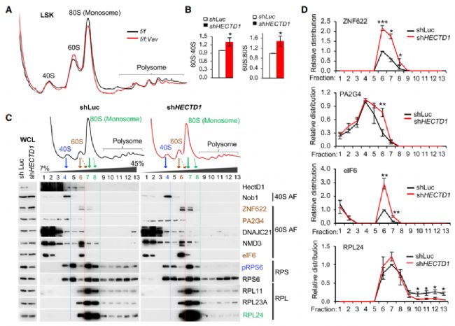 Hectd1 缺失導(dǎo)致 ZNF622 和 eIF6 在 60S 中積累,核糖體亞基連接減少,ZNF622 耗竭后恢復(fù)