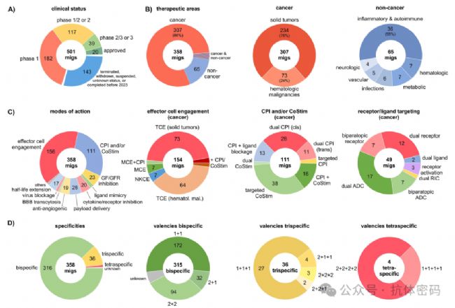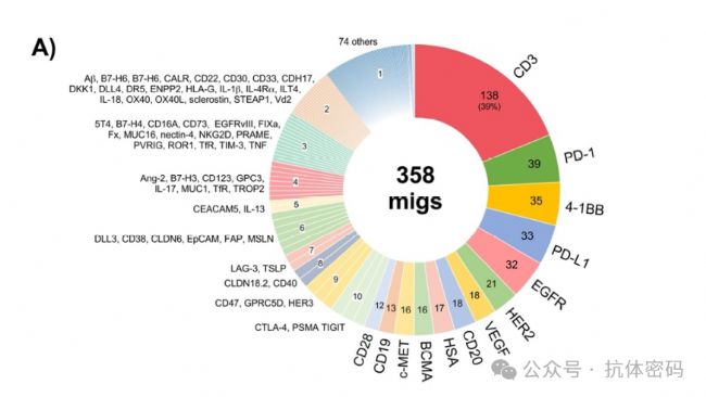 這是migs中最大的類別,占44%。其中,T細胞銜接器(TCEs)占據(jù)絕對主導地位(89%)。它們像一座“橋梁”,一端結(jié)合腫瘤細胞表面的腫瘤相關(guān)抗原(TAA),另一端結(jié)合T細胞表面的CD3等激活受體,從而將T細胞“招募”到腫瘤細胞附近并激活其殺傷功能。此外,約11%的效應細胞銜接器用于 engaging NK細胞或巨噬細胞,例如通過抑制“別吃我”信號來增強巨噬細胞對腫瘤細胞的吞噬作用。