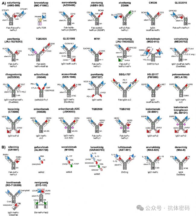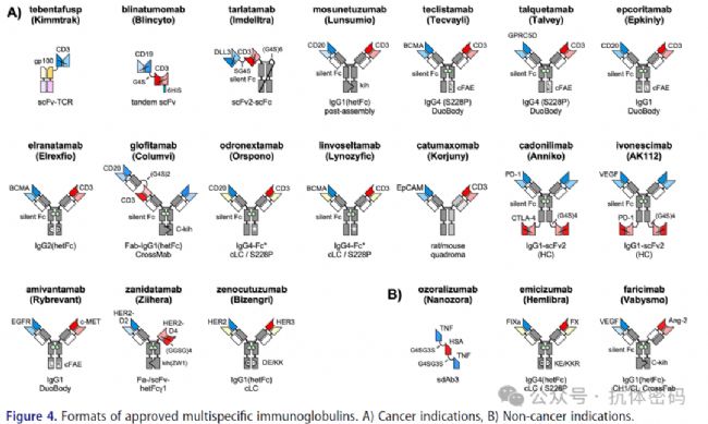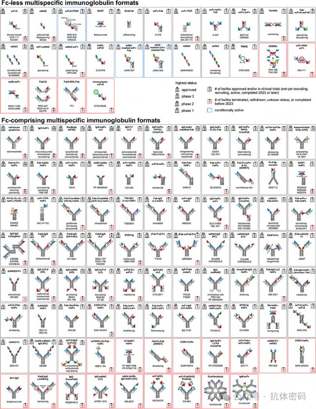 含F(xiàn)c片段格式(Fc-comprising Formats)是目前臨床開發(fā)中的主流(占88%),F(xiàn)c片段可提供長的半衰期(通過FcRn介導的回收)和潛在的效應功能(如ADCC, ADCP)。其設計核心在于解決“重鏈錯配問題”(迫使兩種不同的重鏈異源二聚化)和“輕鏈錯配問題”(確保輕鏈與對應的重鏈正確配對)。