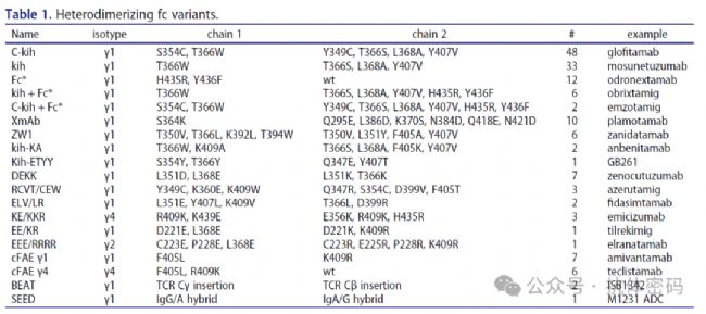 為了防止雙抗重鏈之間的錯誤配對,研究者進行了多種工程化改造,從而能夠使得非對稱的igG-like的雙抗,實現(xiàn)重鏈的正確配對。下表羅列了目前已經(jīng)獲批上市,以及部分已經(jīng)進入臨床的防止重鏈錯配的工程化改造技術(shù),其中Knob-in-Hole或者其變體居多。共占所有使用異源二聚化Fc的migs的55%。其他策略如基于電荷 steering(如DEKK, XmAb)、cFAE(Duobody)等也各具特色。