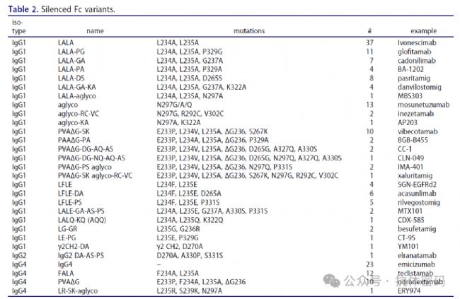 Fc效應功能沉默對于TCE等migs至關(guān)重要,可避免非靶向的免疫細胞激活和細胞因子釋放綜合征(CRS)等副作用。在284款含F(xiàn)c的migs中,有178款(63%)采用了Fc沉默策略。最常見的沉默突變是LALA(L234A, L235A)及其衍生物(如LALA-PG, LALA-GA等)。使用天然低效應功能的IgG4亞型也是一種常見策略。此外,去糖基化(aglyco, 如N297A)也能有效消除FcγR結(jié)合和效應功能。