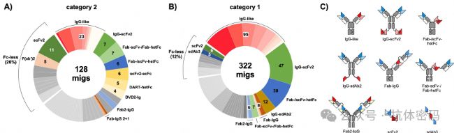 分析顯示,IgG-based結(jié)構(gòu)(包括cLC IgG, DuetMab, CrossMab, Duobody等)、Fab-/scFv-hetFc、以及IgG-scFv2(HC)等格式占據(jù)了活躍在研migs的67%。這表明,在紛繁復雜的結(jié)構(gòu)背后,雙抗或者多抗領(lǐng)域內(nèi)正在圍繞一批經(jīng)過驗證的、具有良好成藥性的平臺技術(shù)進行收斂和優(yōu)化。