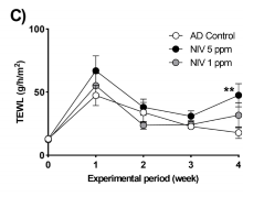 4. 5 ppm NIV暴露加劇了小鼠AD癥狀,增加皮膚厚度和經皮水分流失,皮膚組織病理學顯示表皮結痂、非角化層增生和潰瘍癥狀加重;2.5 ppm NIV暴露可增加經皮水分流失,但對耳皮膚厚度無明顯影響;NIV暴露對皮膚組織中IL-4、IL-5和IL-13的基因表達無明顯影響。