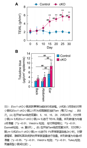 5. 神經(jīng)酰胺組成檢測(cè):在他莫昔芬給藥后0、5、10、15、30天,分離小鼠表皮,加入氯仿/甲醇混合液和鋯珠,經(jīng)組織破碎儀處理后提取脂質(zhì);通過(guò)LC-MS/MS分析神經(jīng)酰胺的種類和數(shù)量,利用氘標(biāo)記標(biāo)準(zhǔn)品進(jìn)行定量,計(jì)算脂肪酸鏈加權(quán)平均長(zhǎng)度。