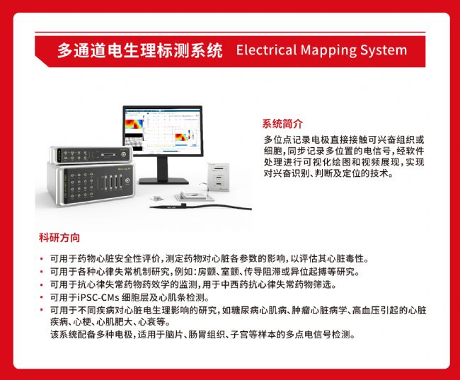 這項(xiàng)技術(shù)是心律失常機(jī)制研究的核心手段,可直觀揭示興奮起源、傳導(dǎo)路徑及異常電信號(hào)特征,同時(shí)用于藥物臨床前心臟安全性評(píng)價(jià)、消融與起搏等療法的在體驗(yàn)證,既為心臟電生理基礎(chǔ)研究提供關(guān)鍵數(shù)據(jù),也成為連接基礎(chǔ)科研與臨床轉(zhuǎn)化的重要橋梁,推動(dòng)心血管疾病診療技術(shù)的優(yōu)化與創(chuàng)新。