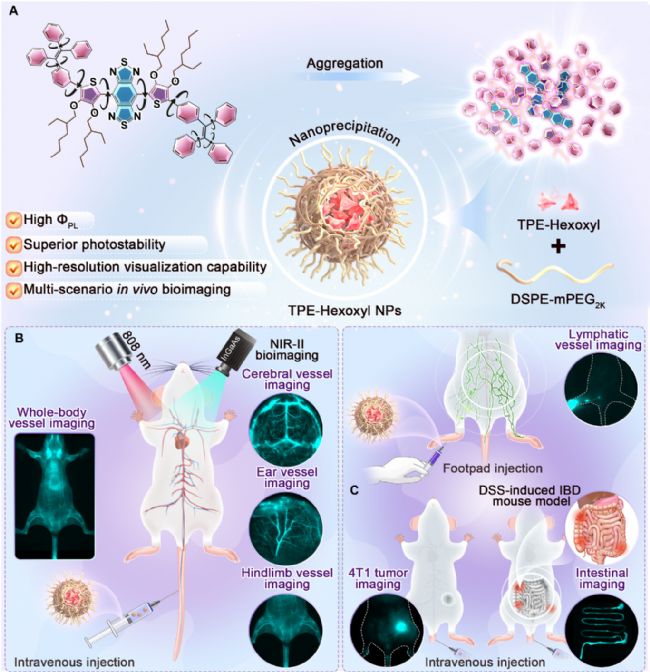 本文要點:為實現(xiàn)精準疾病診斷,高發(fā)光效率的熒光探針至關(guān)重要。為克服近紅外二區(qū)(NIR-II)有機染料長期存在的量子產(chǎn)率低的局限,本文巧妙地設(shè)計了一種聚集誘導(dǎo)發(fā)光(AIE)發(fā)光體TPE-Hexoxyl。通過協(xié)同抑制π-π堆積并最小化分子內(nèi)電荷轉(zhuǎn)移,構(gòu)建出NIR-II納米顆粒,其亮度位居已報道有機探針之列(絕對熒光量子產(chǎn)率ΦPL = 0.9%)。體外研究表明,TPE-Hexoxyl納米顆粒具有優(yōu)異的膠體穩(wěn)定性與顯著的光穩(wěn)定性;铙w成像顯示其具備高空間分辨率與長效組織滯留能力,可實現(xiàn)對全身血管系統(tǒng)、腦微血管網(wǎng)絡(luò)及淋巴系統(tǒng)的動態(tài)高對比度可視化。尤為突出的是,TPE-Hexoxyl納米顆粒在原位4T1荷瘤小鼠模型中對腫瘤病灶的檢測靈敏度顯著提升,并能精確繪制炎癥性腸病模型中炎癥區(qū)域的空間分布,凸顯其在臨床病理診斷中的變革性潛力。本研究確立了一種用于設(shè)計高亮度有機NIR-II熒光團的分子調(diào)控范式,為后續(xù)臨床診斷應(yīng)用提供了先進的分子工具。