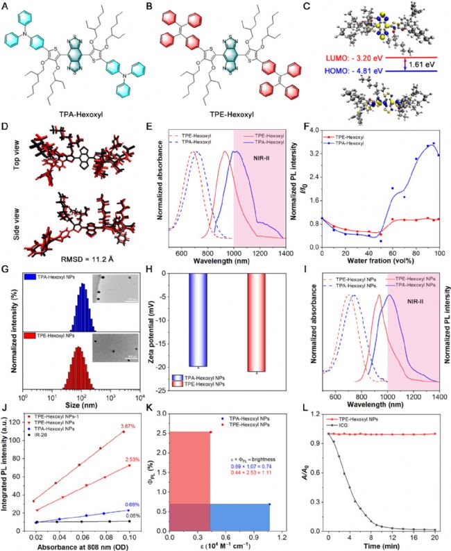 TPA-Hexoxyl和TPE-Hexoxyl化合物以TPA和TPE作為分子轉(zhuǎn)子和電子供體合成(圖1A,B)。兩種化合物均具有典型的D−π−A−π−D結(jié)構(gòu),其中BBTD作為強電子受體。