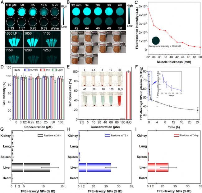 圖2. 體外近紅外二區(qū)熒光成像、組織穿透深度及生物相容性評估