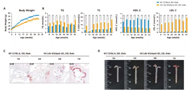 圖5 特殊誘導(dǎo)飲食條件下Ldlr-KO/ApoE-KO雄性小鼠的表型。 A. 小鼠體重曲線; B. 小鼠血脂四項; C. 主動脈瓣油紅O染色; D. 主動脈瓣及主動脈油紅O染色。
