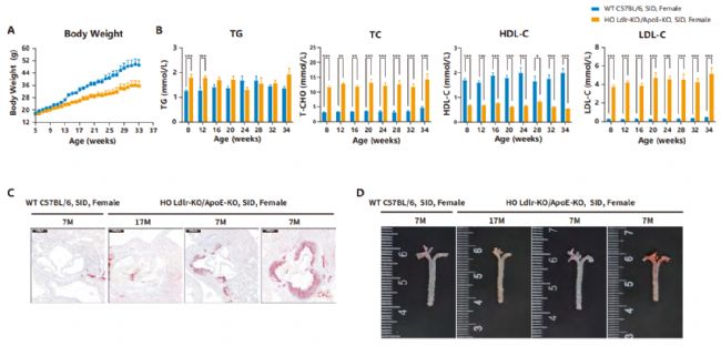圖6 特殊誘導(dǎo)飲食條件下Ldlr-KO/ApoE-KO雌性小鼠的表型。 A. 小鼠體重曲線; B. 小鼠血脂四項; C. 主動脈瓣油紅O染色; D. 主動脈瓣及主動脈油紅O染色。