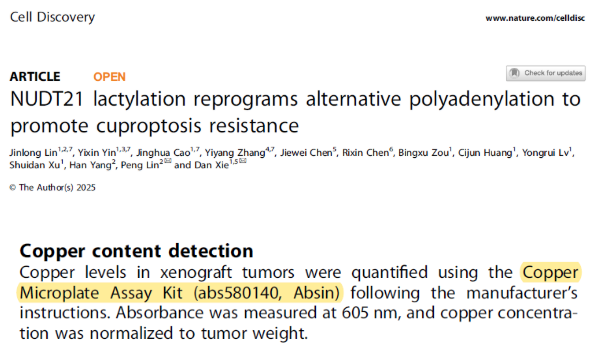 食管癌鱗狀細(xì)胞癌(ESCC)臨床治療長(zhǎng)期受困于 “化療耐藥” 與 “預(yù)后差” 兩大難題,5 年生存率僅 20% 左右。而銅死亡(cuproptosis)作為 2022 年被證實(shí)的新型程序性細(xì)胞死亡方式,雖為癌癥治療打開(kāi)新窗口,卻始終面臨 “代謝如何調(diào)控銅死亡耐藥” 的研究盲區(qū)。近日,中山大學(xué)腫瘤防治中心團(tuán)隊(duì)在《Cell Discovery》發(fā)表重磅研究,首次揭示 “乳酸 - NUDT21-FDX1 - 銅死亡軸” 的核心調(diào)控機(jī)制 —— 其中 Absin 的Copper Microplate Assay Kit(貨號(hào):abs580140) 為關(guān)鍵實(shí)驗(yàn)驗(yàn)證提供了精準(zhǔn)檢測(cè)支持,助力研究結(jié)論登上頂刊!