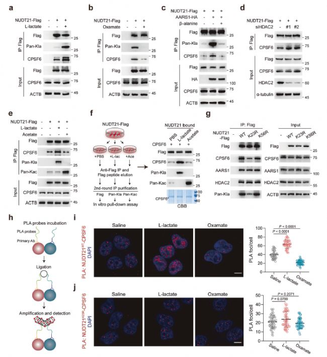 NUDT21 的 K23 位點(diǎn)會(huì)被乳酸修飾(“乳酸化”),且由 AARS1(寫(xiě)入酶)催化、HDAC2(擦除酶)反向調(diào)控;