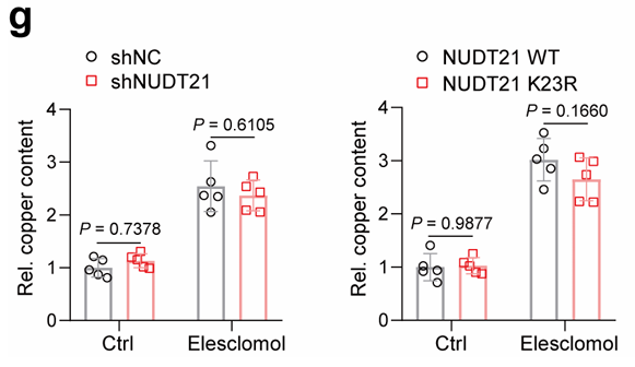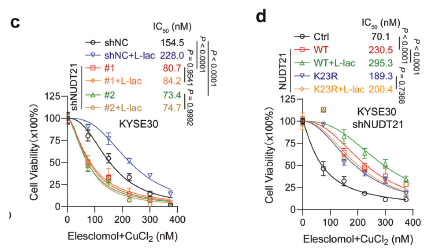 細(xì)胞層面:敲低 NUDT21 或抑制其 K23 乳酸化,ESCC 細(xì)胞對(duì)銅離子載體 elesclomol 的敏感性提升 3 倍;
