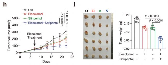 動(dòng)物層面:臨床獲批的 LDHA 抑制劑 stiripentol,與 elesclomol 聯(lián)合使用,可使 ESCC 移植瘤體積縮小 65%。