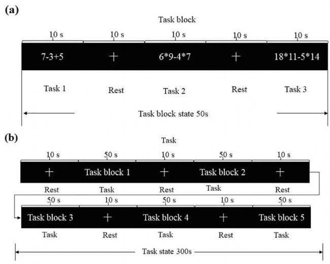 圖1. 實(shí)驗(yàn)范式。(a) 單個(gè)任務(wù)區(qū)塊;(b) 包含五個(gè)任務(wù)區(qū)塊與五個(gè)靜息區(qū)塊的完整實(shí)驗(yàn)流程