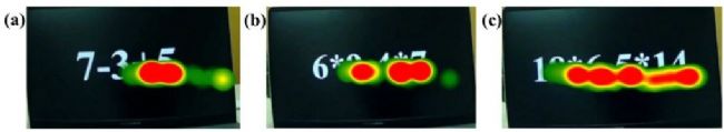 圖 5. 任務(wù)執(zhí)行過程中屏幕上的眼部熱圖。(a) (b) (c)依次為低中高難度任務(wù)的熱圖