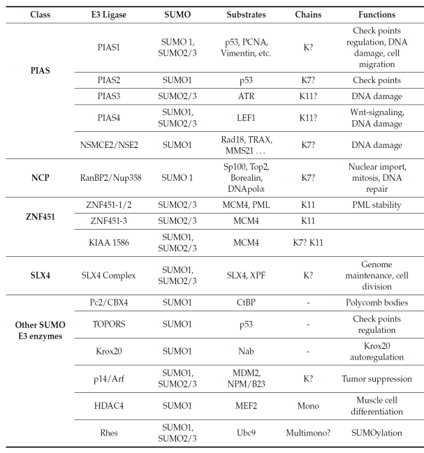 (3)連接:SUMO 連接酶(E3,如 PIAS 家族、RanBP2 等)介導(dǎo) SUMO 與靶蛋白結(jié)合,部分靶蛋白可在 Ubc9 介導(dǎo)下直接發(fā)生 SUMO 化(無 E3 參與)。