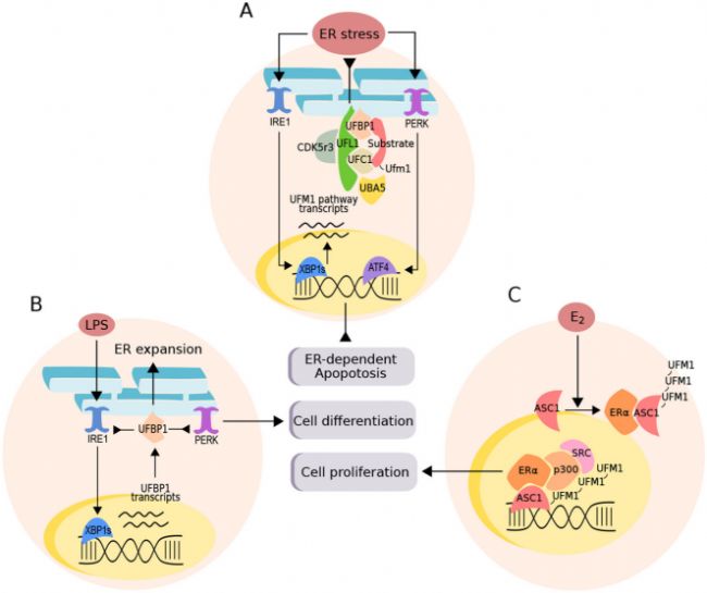 A圖:介導(dǎo)內(nèi)質(zhì)網(wǎng)應(yīng)激。這是猶素化最經(jīng)典的生物學(xué)功能。內(nèi)質(zhì)網(wǎng)應(yīng)激(ER stress)激活內(nèi)質(zhì)網(wǎng)膜上的 IRE1 和 PERK 兩條信號通路,并引發(fā)猶素化級聯(lián)反應(yīng):UFM1 經(jīng)過 UBA5(E1 激活酶)、UFC1(E2 結(jié)合酶)和 UFL1(E3 連接酶)的催化,最終結(jié)合到底物蛋白上。UFBP1作為核心底物和支架蛋白,它的猶素化是整個(gè)通路的關(guān)鍵節(jié)點(diǎn)。CDK5R3與 UFL1 形成復(fù)合物,輔助完成修飾過程。最終激活下游XBP1s 和 ATF4 等轉(zhuǎn)錄因子,啟動(dòng)內(nèi)質(zhì)網(wǎng)應(yīng)激應(yīng)答(UPR),并最終調(diào)控內(nèi)質(zhì)網(wǎng)依賴的凋亡、細(xì)胞分化和增殖。