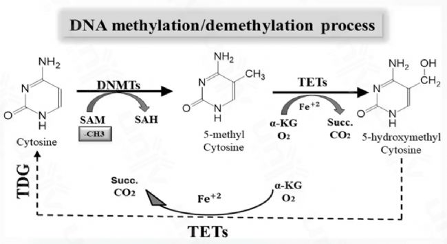 · 第一步氧化:TET 酶(需要 Fe²⁺、α- 酮戊二酸(α-KG)和 O₂作為輔助因子)將 5 - 甲基胞嘧啶氧化為5 - 羥甲基胞嘧啶(5-hydroxymethyl Cytosine)。