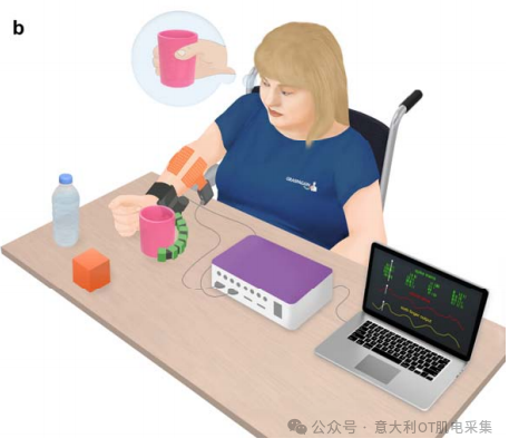 本研究采用了一套完整的神經(jīng)信號采集、解碼與機(jī)械控制流程。信號采集:使用意大利OT Bioelettronica公司生產(chǎn)的Quattrocento多通道放大器(16位A/D轉(zhuǎn)換),以2048 Hz采樣頻率記錄HDsEMG信號。兩個8x8電極網(wǎng)格(極間距10 mm)置于前臂,覆蓋伸肌與屈肌群。信號通過OT BioLab Light軟件以TCP/IP協(xié)議實時流式傳輸,刷新頻率為32 Hz。神經(jīng)接口:分為離線和在線分解兩步。離線階段,患者觀看虛擬手張合視頻并嘗試跟隨動作,同時記錄20秒HDsEMG數(shù)據(jù)。采用結(jié)合快速獨立成分分析(FastICA)與卷積球面化的盲源分離技術(shù),分解出約15個運動單元及其脈沖序列,并計算運動單元集合力模型。在線階段,直接應(yīng)用離線得到的分離矩陣對實時信號進(jìn)行分解,檢測峰值并做模板匹配(相關(guān)系數(shù)≥0.6),最終生成歸一化的控制信號。機(jī)電接口:控制信號通過UDP協(xié)議傳輸,由LabVIEW橋接至機(jī)械手指的微控制器(藍(lán)牙連接)。機(jī)械第六指為腱驅(qū)動軟硬混合結(jié)構(gòu),重154克,長151毫米,由單伺服電機(jī)驅(qū)動,指尖覆有硅膠以增加摩擦。為確保系統(tǒng)穩(wěn)定,控制信號以約10.66 Hz的頻率發(fā)送至機(jī)械指。