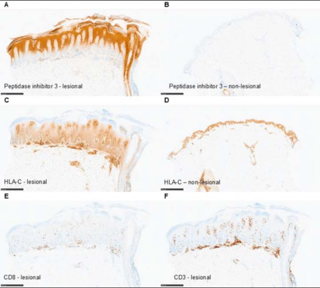 圖3 免疫組織化學檢測顯示,病變表皮中PI3蛋白高度表達,同時伴有HLA-C表達以及細胞毒性T細胞的浸潤