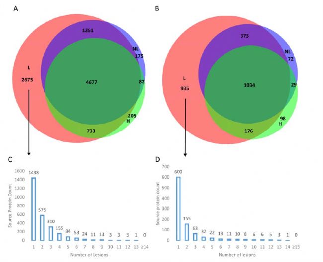 圖 4.病變皮膚與未病變皮膚之間的源蛋白重疊情況以及對病變特異性源蛋白的分析