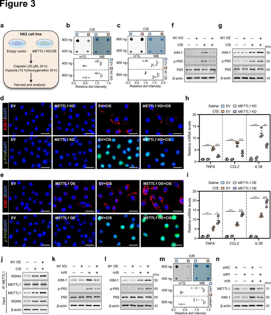 研究進(jìn)一步在HK2細(xì)胞中進(jìn)行功能獲得和功能缺失驗證體外實驗。METTL1敲低可抑制順鉑誘導(dǎo)的m7G水平升高、NF-κB活化(p-P65)及炎癥因子(TNF-α, CCL2, IL-1β)表達(dá),而過表達(dá)METTL1則加劇這些損傷表型(圖3b-i)。類似結(jié)果在H/R和LPS刺激模型以及小鼠原代TECs中得到重復(fù)驗證(圖3k-n)。Co-IP實驗進(jìn)一步表明,METTL1促損傷作用與其和WDR4的互作增強(qiáng)相關(guān)(圖3j)。上述研究結(jié)果驗證了METTL1在腎小管上皮細(xì)胞中是AKI的致病因子。