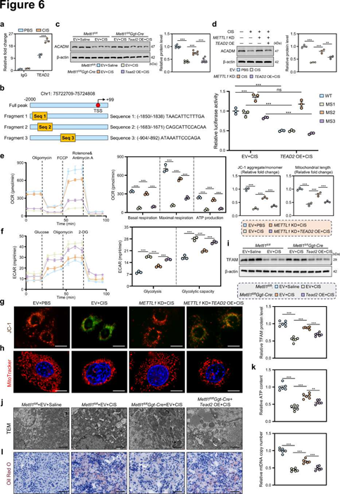 既往研究報道TEAD2在腫瘤中作為代謝酶的轉(zhuǎn)錄抑制因子,研究者深入探索TEAD2如何導(dǎo)致線粒體功能障礙。通過生物信息學(xué)預(yù)測和ChIP-qPCR驗證,發(fā)現(xiàn)TEAD2能直接結(jié)合到中鏈酰基輔酶A脫氫酶(ACADM)基因的啟動子區(qū)域(圖6a)。ACADM是線粒體脂肪酸β-氧化(FAO)的關(guān)鍵限速酶。雙熒光素酶報告實驗進(jìn)一步確定TEAD2結(jié)合的具體序列,并證實TEAD2過表達(dá)會抑制ACADM的啟動子活性(圖6b)。在AKI模型中,ACADM表達(dá)被抑制,而Mettl1敲除可恢復(fù)其表達(dá),這種恢復(fù)效應(yīng)可被TEAD2過表達(dá)所抵消(圖6c-d)。